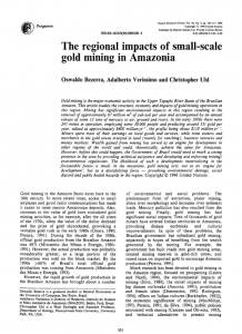 Gold mining is the major economic activity in the Upper Tapajós River Basin of the Brazilian Amazon. This article studies the structure, economy and impacts of gold mining operations in this region. Mining has significant environmental impacts in this region resulting in the removal of approximately 67 million m3 of sub-soil per year and accompanied by an annual release of some 12 tons of mercury to air, ground and rivers. In the early 1990s there were 245 mines in operation, employing some 30000 people and producing around 35t gold per year, valued at approximately $400 million yr-1, the profits being about $110 million yr-1. Miners spent most of their earnings on local goods and services, while mine owners and merchants in the gold towns invested in land (mainly for ranching), business ventures and money markets. Wealth gained from mining has served as an engine for development in other regions of the world and could, theoretically, achieve the same for Amazonia. However, before this could happen, the Government of Brazil would need to mark a strong presence in the area by providing technical assistance and developing and enforcing mining/environmental regulations. The likelihood of such a development materializing in the foreseeable future is small. In the meantime, gold mining acts, not as an ‘engine for development’, but as a destabilizing force — provoking environmental damage, social discord and public health hazards in the region.