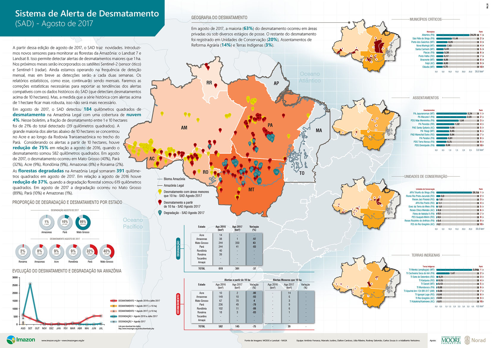 Em agosto de 2017, o SAD detectou 184 quilômetros quadrados de desmatamento na Amazônia Legal com uma cobertura de nuvem 4%. Nesse boletim, a fração de desmatamento entre 1 e 10 hectares foi de 21% do total detectado (39 quilômetros quadrados). A grande maioria dos alertas abaixo de 10 hectares se concentrou no Acre e ao longo da Rodovia Transamazônica no trecho do Pará. Considerando os alertas a partir de 10 hectares, houve redução de 75% em relação a agosto de 2016, quando o desmatamento somou 582 quilômetros quadrados. Em agosto de 2017, o desmatamento ocorreu em Mato Grosso (40%), Pará (32%), Acre (9%), Rondônia (9%), Amazonas (8%) e Roraima (2%). As florestas degradadas na Amazônia Legal somaram 391 quilômetros quadrados em agosto de 2017. Em relação a agosto de 2016 houve redução de 37%, quando a degradação florestal somou 619 quilômetros quadrados. Em agosto de 2017 a degradação ocorreu no Mato Grosso (89%), Pará (10%) e Amazonas (1%).