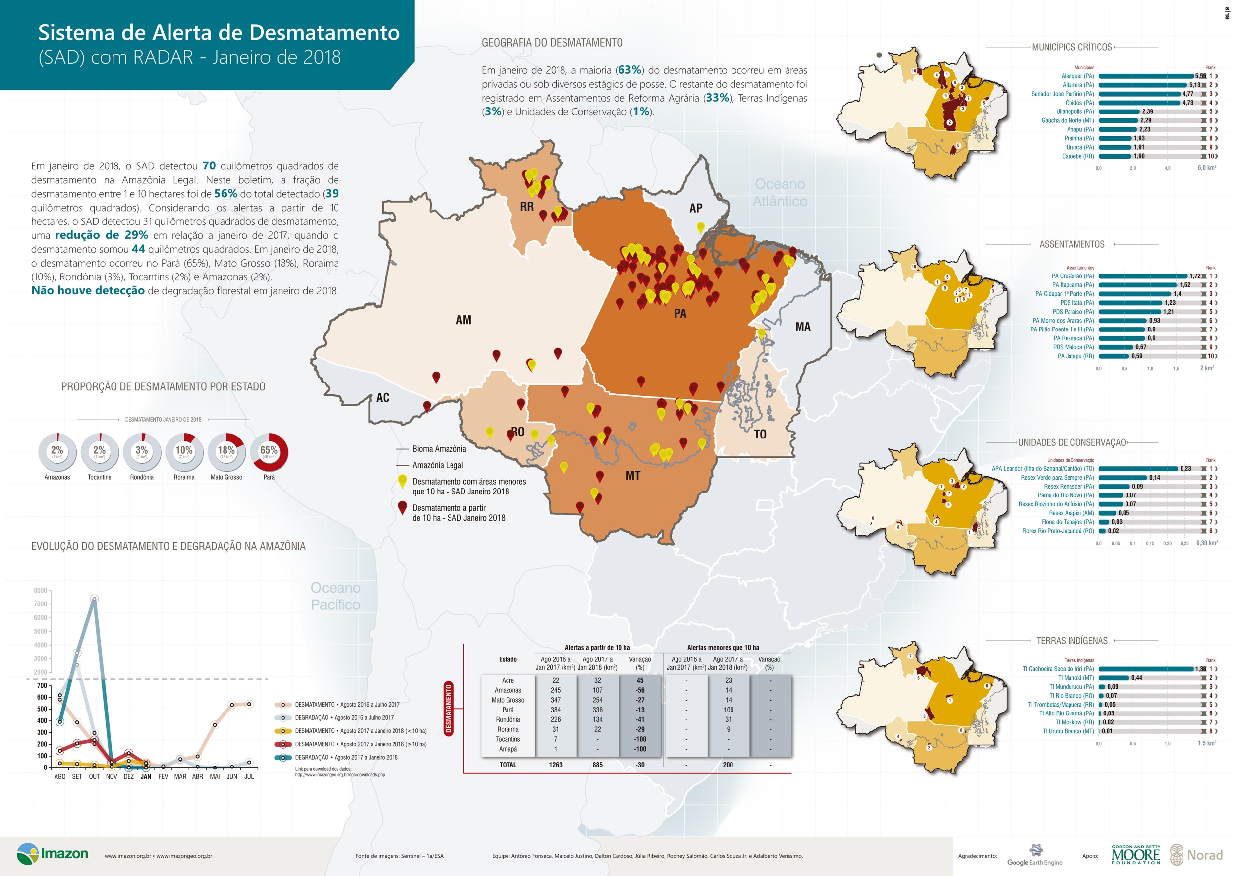 Em janeiro de 2018, o SAD detectou 70 quilômetros quadrados de desmatamento na Amazônia Legal. Neste boletim, a fração de desmatamento entre 1 e 10 hectares foi de 56% do total detectado (39 quilômetros quadrados). Considerando os alertas a partir de 10 hectares, o SAD detectou 31 quilômetros quadrados de desmatamento, uma redução de 29% em relação a janeiro de 2017, quando o desmatamento somou 44 quilômetros quadrados. Em janeiro de 2018, o desmatamento ocorreu no Pará (65%), Mato Grosso (18%), Roraima (10%), Rondônia (3%), Tocantins (2%) e Amazonas (2%).