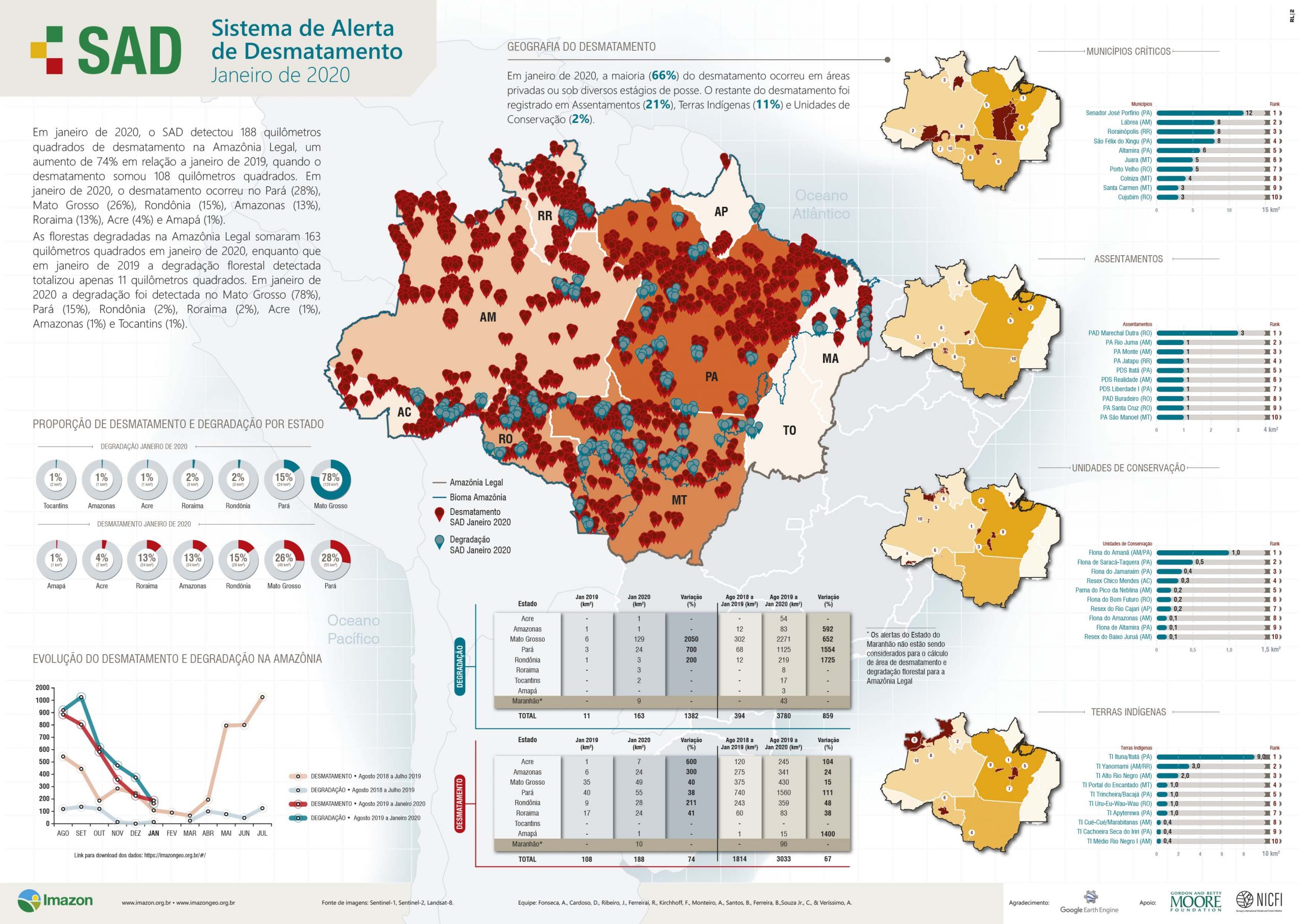 Em janeiro de 2020, o SAD detectou 188 quilômetros quadrados de desmatamento na Amazônia Legal, um aumento de 74% em relação a janeiro de 2019, quando o desmatamento somou 108 quilômetros quadrados. Em janeiro de 2020, o desmatamento ocorreu no Pará (28%), Mato Grosso (26%), Rondônia (15%), Amazonas (13%), Roraima (13%), Acre (4%) e Amapá (1%).