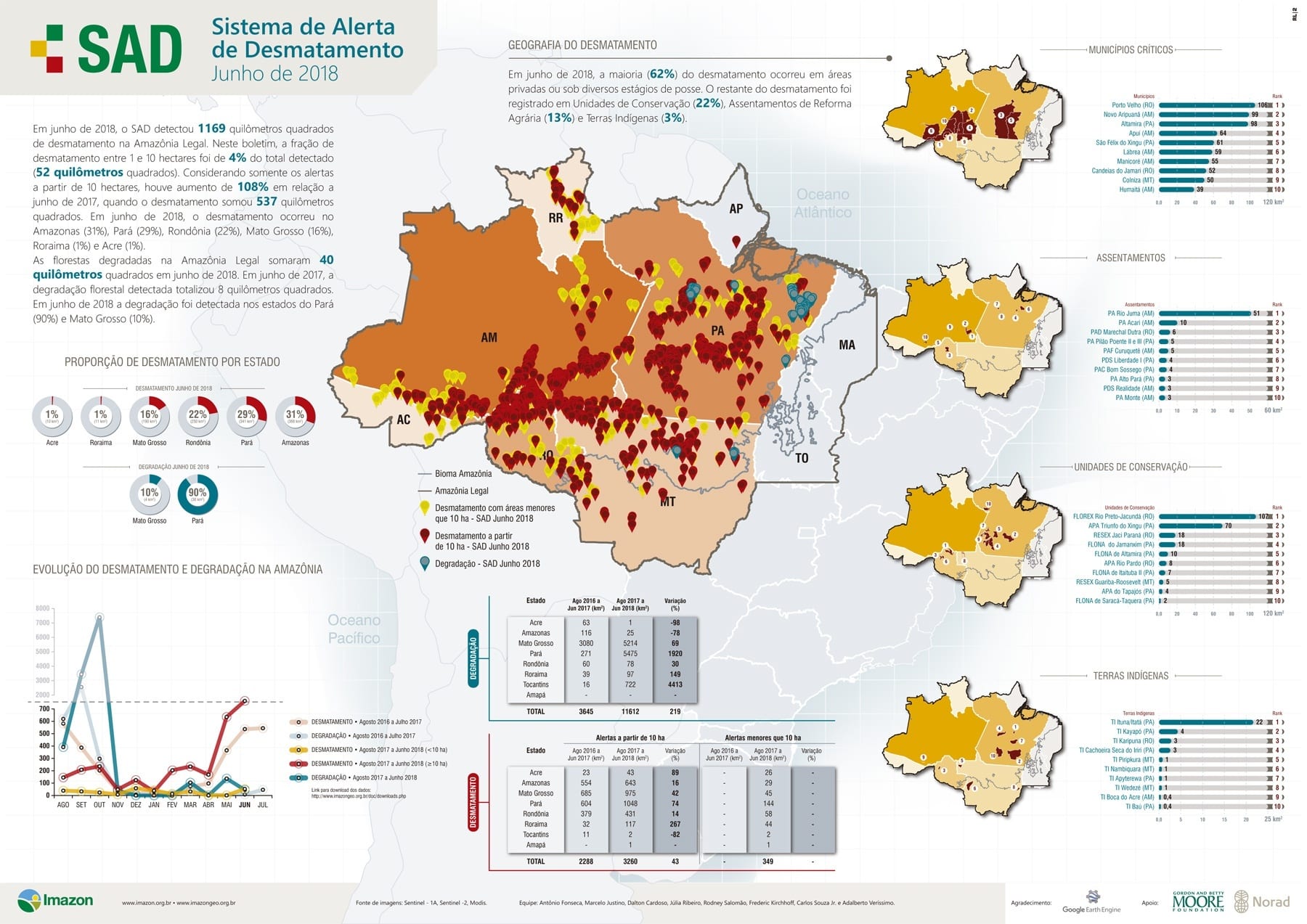 Em junho de 2018, o SAD detectou 1169 quilômetros quadrados de desmatamento na Amazônia Legal. Neste boletim, a fração de desmatamento entre 1 e 10 hectares foi de 4% do total detectado (52 quilômetros quadrados). Considerando somente os alertas a partir de 10 hectares, houve aumento de 108% em relação a junho de 2017, quando o desmatamento somou 537 quilômetros quadrados. Em junho de 2018, o desmatamento ocorreu no Amazonas (31%), Pará (29%), Rondônia (22%), Mato Grosso (16%), Roraima (1%) e Acre (1%). As florestas degradadas na Amazônia Legal somaram 40 quilômetros quadrados em junho de 2018. Em junho de 2017, a degradação florestal detectada totalizou 8 quilômetros quadrados. Em junho de 2018 a degradação foi detectada nos estados do Pará (90%) e Mato Grosso (10%).