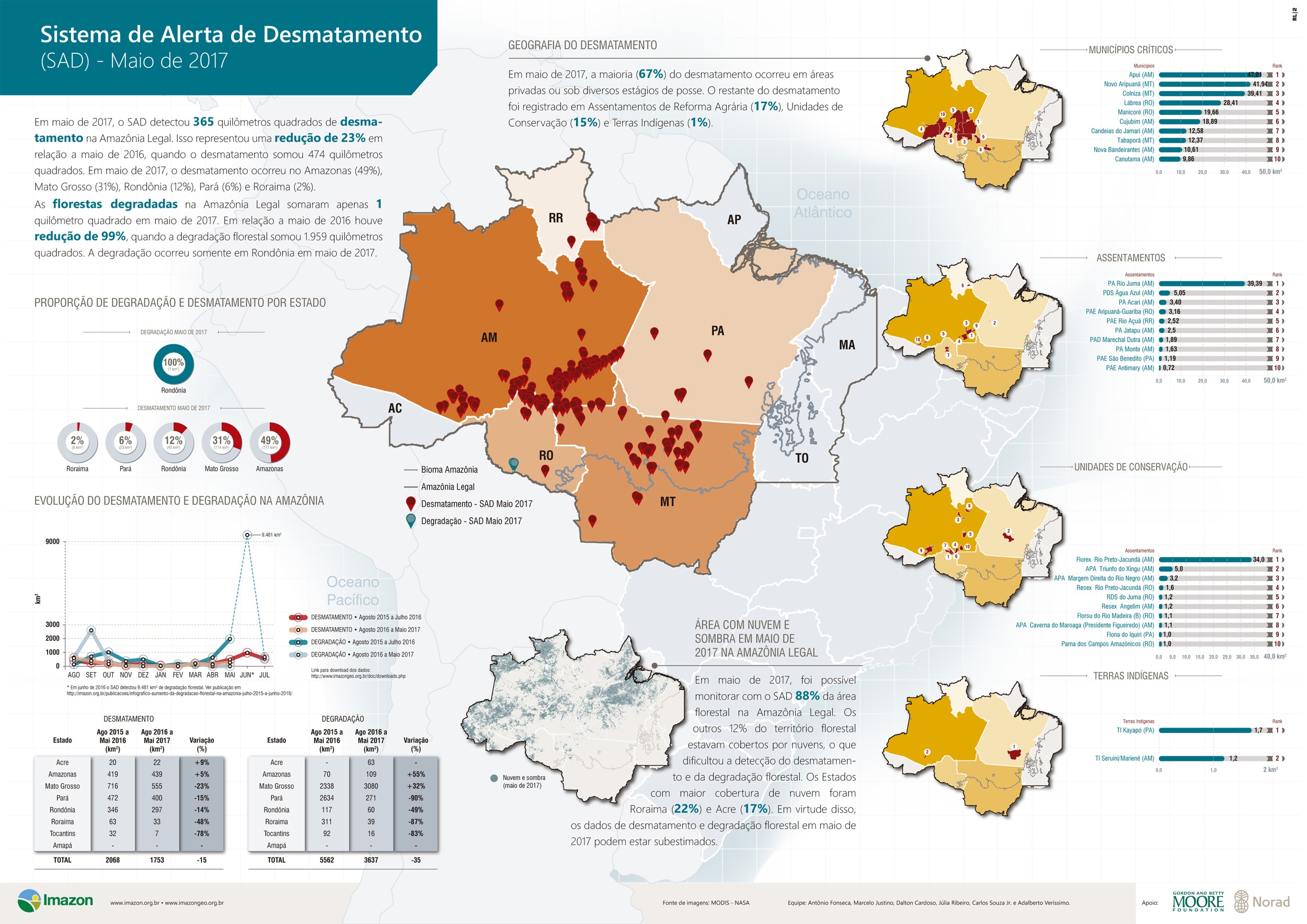 Fonseca, A., Justino, M., Cardoso, D., Ribeiro, J., Souza Jr., C., & Veríssimo, A. 2017. Boletim do desmatamento da Amazônia Legal (maio de 2017) SAD (p. 1). Belém: Imazon.