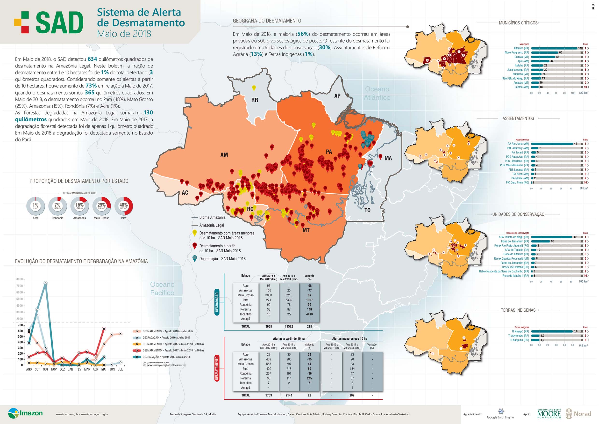 Fonseca, A., Justino, M., Cardoso, D., Ribeiro, J., Salomão, R., Souza Jr., C., & Veríssimo, A. 2018. Boletim do desmatamento da Amazônia Legal (maio 2018) SAD (p. 1). Belém: Imazon. Em Maio de 2018, o SAD detectou 634 quilômetros quadrados de desmatamento na Amazônia Legal. Neste boletim, a fração de desmatamento entre 1 e 10 hectares foi de 1% do total detectado (3 quilômetros quadrados). Considerando somente os alertas a partir de 10 hectares, houve aumento de 73% em relação a Maio de 2017, quando o desmatamento somou 365 quilômetros quadrados. Em Maio de 2018, o desmatamento ocorreu no Pará (48%), Mato Grosso (29%), Amazonas (15%), Rondônia (7%) e Acre (1%). As florestas degradadas na Amazônia Legal somaram 130 quilômetros quadrados em Maio de 2018. Em Maio de 2017, a degradação florestal detectada foi de apenas 1 quilômetro quadrado. Em Maio de 2018 a degradação foi detectada somente no Estado do Pará. Geografia do desmatamento Em Maio de 2018, a maioria (56%) do desmatamento ocorreu em áreas privadas ou sob diversos estágios de posse. O restante do desmatamento foi registrado em Unidades de Conservação (30%), Assentamentos de Reforma Agrária (13%) e Terras Indígenas (1%).