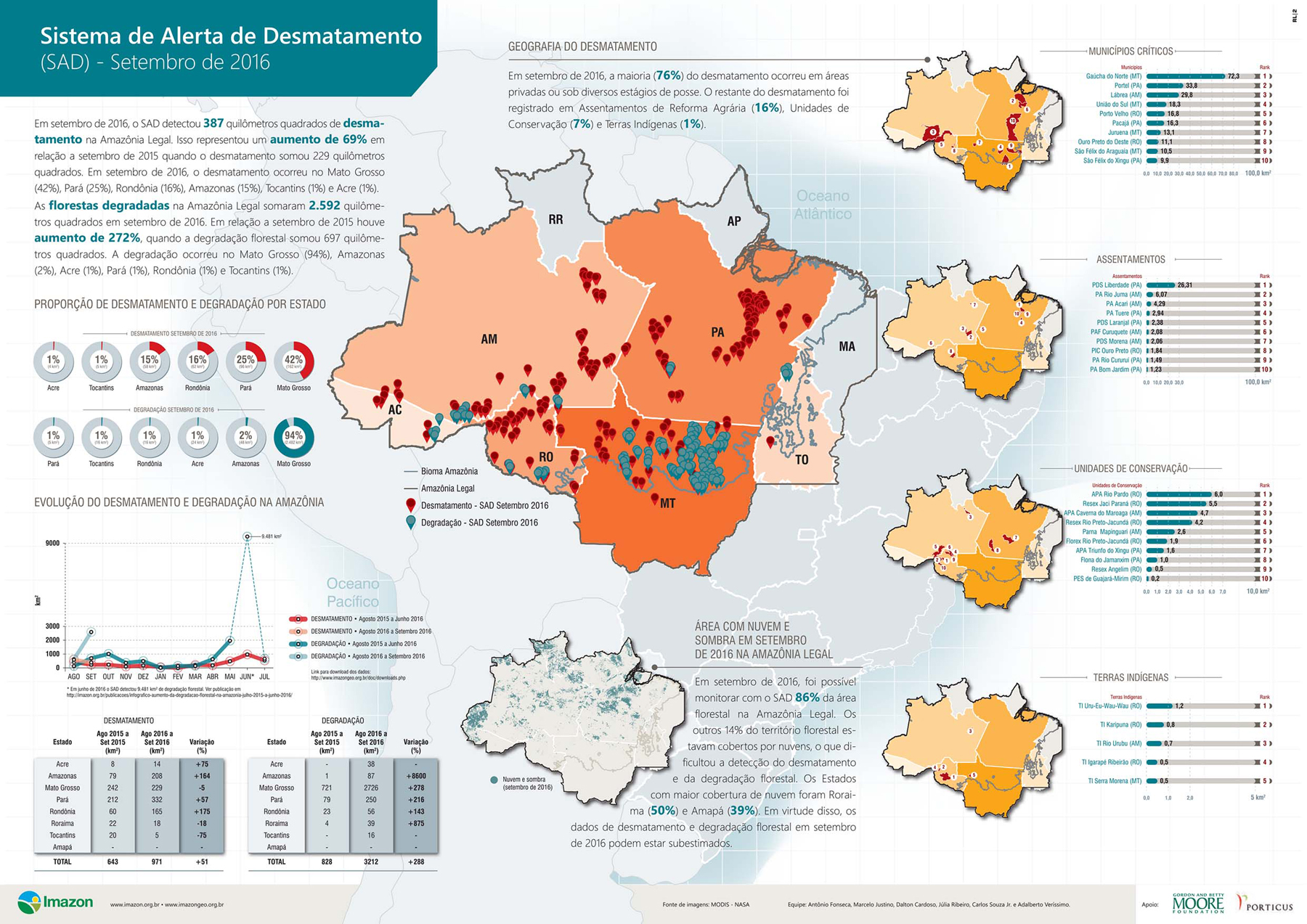 Em setembro de 2016, o SAD detectou 387 quilômetros quadrados de desmatamento na Amazônia Legal. Isso representou um aumento de 69% em relação a setembro de 2015 quando o desmatamento somou 229 quilômetros quadrados.