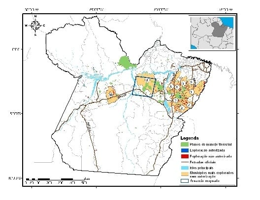 Monteiro, A., Conrado, D., Cardoso, D., Veríssimo, A., & Souza Jr., C. 2010. Boletim Transparência Manejo Florestal Estado do Pará (2008 e 2009) (p. 16). Belém: Imazon. Neste boletim Transparência Manejo Florestal do Pará avaliamos a situação da exploração de madeira no Estado entre agosto de 2008 e julho de 2009. Para isso, utilizamos informações dos sistemas de controle florestal da Sema (Secretaria de Estado de Meio Ambiente do Pará): Simlam (Sistema Integrado de Licenciamento e Monitoramento Ambiental) e Sisflora (Sistema de Comercialização e Transporte de Produtos Florestais (Sisflora). Essas informações foram também cruzadas com aquelas geradas pelo Simex (Sistema de Monitoramento da Exploração Madeireira desenvolvido pelo Imazon) (Quadro 1) no âmbito do Programa de Apoio ao Manejo Florestal (Quadro 2). De acordo com o Simlam, a produção florestal no Estado do Pará em 2008 foi de aproximadamente 3,5 milhões de metros cúbicos de madeira em tora e 4,4 milhões de metros cúbicos de resíduos florestais. Em 2009, o Estado produziu aproximadamente 3,8 milhões de metros cúbicos de madeira em tora e 2,3 milhões de metros cúbicos de resíduos florestais. Nos dois anos, a grande maioria (98% em 2008 e 89% em 2009) dessa produção originou-se de manejo de floresta nativa e o restante, de manejo de floresta plantada (2% em 2008 e 11% em 2009). A análise das imagens de satélite revelou que aproximadamente 128.500 hectares de florestas foram explorados entre agosto de 2008 e julho de 2009. Desse total, 94.385 hectares (73%) não foram autorizados pela Sema, contra 34.171 hectares (27%) autorizados. Do total não autorizado, a maioria (83%) ocorreu em áreas privadas, devolutas ou sob disputa; outros 11% ocorreram em assentamentos de reforma agrária; e 6%, em Áreas Protegidas. Quando comparado ao período anterior analisado (agosto de 2007 a julho de 2008), observamos uma redução de 75% (278.209 hectares) na área explorada sem autorização. Nas áreas exploradas com autorização da Sema avaliamos a situação das AUTEFs (Autorização de Exploração Florestal) e verificamos que a maioria (91%) estava regular. Os 9% restantes apresentavam algum tipo de inconsistência, tais como manejo autorizado em área desmatada; manejo autorizado em área já explorada; e área autorizada maior do que a área total do manejo. Ao compararmos a proporção de AUTEFs com inconsistências entre 2008 e 2009, observamos uma redução de 76% nos casos de áreas autorizadas em áreas desmatadas; de 53% naqueles de áreas autorizadas em áreas exploradas; de 53% nos casos de áreas autorizadas maiores que as áreas de manejo; e de 100% nos de crédito comercializado maior que o autorizado. Para avaliarmos a qualidade do manejo florestal nas áreas autorizadas, selecionamos 59 AUTEFs cujas áreas foi possível detectar sinais de exploração florestal nas imagens de satélite. A análise das imagens mostrou que na maioria (64%) dessas áreas o manejo era de qualidade intermediária; em outros 14% a qualidade era boa; e somente em 22% a exploração era de baixa qualidade. Quando comparamos esses resultados entre os períodos de agosto de 2007 a julho de 2008 e agosto de 2008 a julho de 2009 observamos que a áreas com exploração de qualidade boa diminuiu 71% e as de qualidade intermediária e baixa aumentaram 194% e 28%, respectivamente. Por último, verificamos nas imagens de satélite de 2009 (agosto de 2008 a julho de 2009) que em 97% das áreas de manejo florestal avaliadas entre agosto de 2007 e julho de 2008 a floresta foi mantida, enquanto em apenas 3% houve desmatamento. Baixe aqui o arquivo