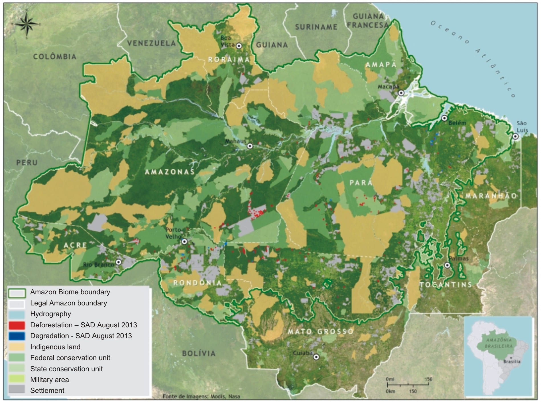 SAD detected 185 square kilometers of deforestation in the Legal Amazon in August 2013 Martins, H., Fonseca, A., Souza Jr., C., Sales, M., & Veríssimo, A. 2013. Forest Transparency for the Brazilian Amazon (June 2013) (p. 13). Belém. SAD detected 185 square kilometers of deforestation in the Legal Amazon in August 2013. That represented a 20% reduction in relation to August 2012 when deforestation totaled 232 square kilometers. Among the states, deforestation occurred mainly in Pará (41%) and Amazonas (28%) Degraded forests in the Legal Amazon totaled 92 square kilometers in August 2013. In relation to August 2012, when forest degradation totaled 60 square kilometers, there was an increase of 53%. It was possible to monitor 80% of the forest area in the Legal Amazon, where as in August 2012 there were fewer clouds and it was possible to monitor 84% of the territory.SAD detected 185 square kilometers of deforestation in the Legal Amazon in August 2013. That represented a 20% reduction in relation to August 2012 when deforestation totaled 232 square kilometers. Among the states, deforestation occurred mainly in Pará (41%) and Amazonas (28%) Degraded forests in the Legal Amazon totaled 92 square kilometers in August 2013. In relation to August 2012, when forest degradation totaled 60 square kilometers, there was an increase of 53%. It was possible to monitor 80% of the forest area in the Legal Amazon, where as in August 2012 there were fewer clouds and it was possible to monitor 84% of the territory. Baixe aqui o arquivo