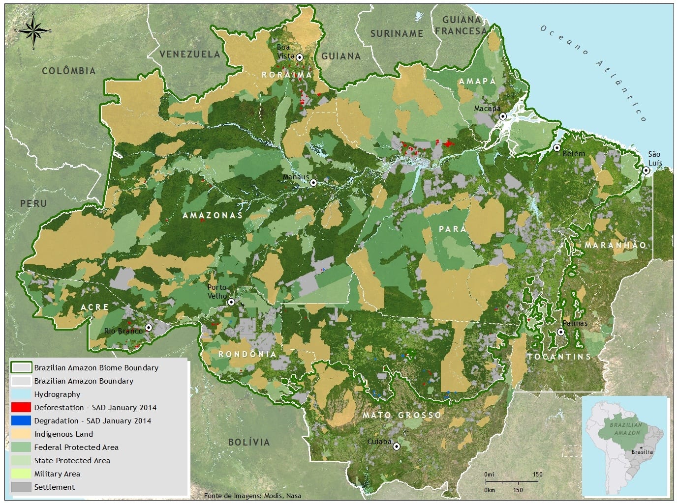 The forest degradation accumulated in the period from August 2013 to January 2014 totaling 531 square kilometers. Fonseca, A., Martins, H., Souza Jr., C., Sales, M., & Veríssimo, A. 2014. . Forest Transparency for the Brazilian Amazon (january 2014) (p. 11). Belém: Imazon. In January 2014, the majority (58%) of the forest area of Brazilian Amazon was covered by clouds, a coverage lower than January 2013 (61%), which reduced the ability to detect deforestation and forest degradation in the region. The States with the largest cloud coverage were Amapá (86%), Pará (83%) and Rondônia (79%). During the period analyzed, and under these cloud conditions, were detected by SAD, 107 square kilometers of deforestation in the Brazilian Amazon. This represents na increase of 206% compared to January 2013 when the deforestation totaled 35 square kilometers. The forest degradation accumulated in the period from August 2013 to January 2014, corresponding to the first six months of the current calendar of deforestation, totaling 531 square kilometers. There was a reduction of the accumulated deforestation of 60% over the previous period (August 2012 to January 2013) when the deforestation totaled 1.326 square kilometers. The degraded forests totaled 32 square kilometers in January 2014. Compared to January 2013 there was a reduction of 53% when the forest degradation totaled 69 square kilometers. The vast majority (97%) occurred in Mato Grosso, followed by Amazonas (2%) and Pará (1%). The forest degradation accumulated from August 2013 to January 2014 totaled 212 square kilometers. Compared to the previous period (August 2012 to January 2013) was reduced by 80% when the forest degradation totaled 1,043 square kilometers. Baixe aqui o arquivo
