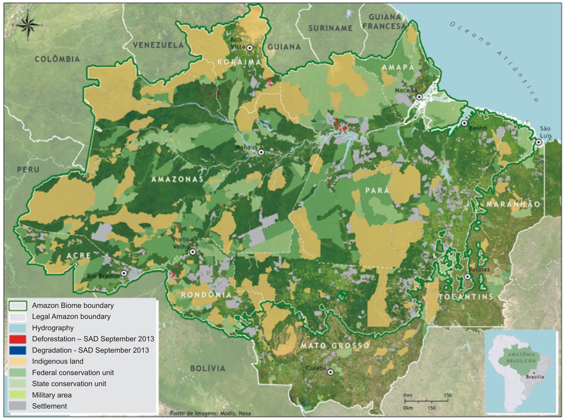 SAD detected 37 square kilometers of deforestationin the Legal Amazon. Martins, H., Fonseca, A., Souza Jr., C., Sales, M., & Veríssimo, A. 2013. Forest Transparency for the Brazilian Amazon (November 2013) (p. 11). Belém. In November 2013, SAD detected 37 square kilometers of deforestationin the Legal Amazon. That represents a drop of 33% in relationto November 2012 when deforestation totaled 55 square kilometers. Of that total, 26% occurred in Pará, followed by Roraima (22%), Amazonas (17%) and Rondônia (17%). Due to cloud cover, it was possible to monitor only 42% of the territory while in November 2012 it was possible to monitor 50% of the Amazon. The deforestation accumulated in the period from August 2013 to November 2013 was 368 square kilometers. There was a reduction of 70% in relationto the previous period (August 2012 to November 2012) when deforestation totaled 1,206 square kilometers. Degraded forests totaledonly 9 square kilometers in November 2013. In relation to November 2012 there was a reduction of 91% when forest degradation totaled 100 square kilometers. The great majority (60%) occurred in Mato Grosso, followed by Pará (40%). Forest degradation accumulated during the period from August 2013 to November 2013 totaled 157 square kilometers. In relation to the previous period (August 2012 to November 2012), when forest degradation totaled 711 square kilometers, there was a reduction of 78%. Baixe aqui o arquivo