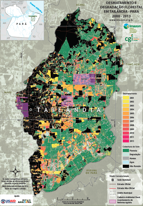 Fonseca, A., Justino, M., Siqueira, J., Ribeiro, J., & Souza Jr., C. 2014. Desmatamento e Degradação Florestal em Tailândia - Pará (2000-2013) (p. 2). Belém: Centro de Geotecnologia do Imazon (CGI). Baixe aqui o arquivo