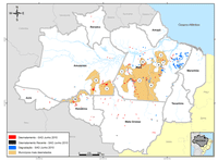 Hayashi, S., Souza Jr, C., Sales, M. & Veríssimo, A. In June, 2010, SAD detected 172 square kilometers of deforestation in the Legal Amazon. That represented an increase of 15% in relation to June, 2009 when deforestation totaled 150 square kilometers. The accumulated deforestation for the period of August, 2009 to June, 2010 totaled 1,333 square kilometers. In comparison with the previous period of August, 2008 to June, 2009 (when deforestation totaled 1,234 square kilometers), there was an 8% increase. In June, 2010, the majority (67%) of the deforestation occurred in Pará. The remainder occurred in Amazonas (13%) then Mato Grosso (10%), Rondônia (8%), Acre (1%), Roraima (0.5%) and Tocantins (0.5%). The accumulated deforestation for the period of August, 2009 to June, 2010 resulted in the commitment of 85 million tons of C02 equivalent, which are subject to direct and future emissions due to burning and decomposition events. That represents an increase of 3% in relation to the previous period (August, 2008 to June, 2009) when the forest carbon affected by deforestation was around 87 million tons of C02 equivalent. The degraded forests (forests intensely exploited through logging activity and/or burning) in the Legal Amazon totaled 402 square kilometers in June, 2010. Of that total, almost all (97%) occurred in Pará. In June, 2010, it was possible to monitor 75% of the area with forest cover in the Legal Amazon. Download the file here