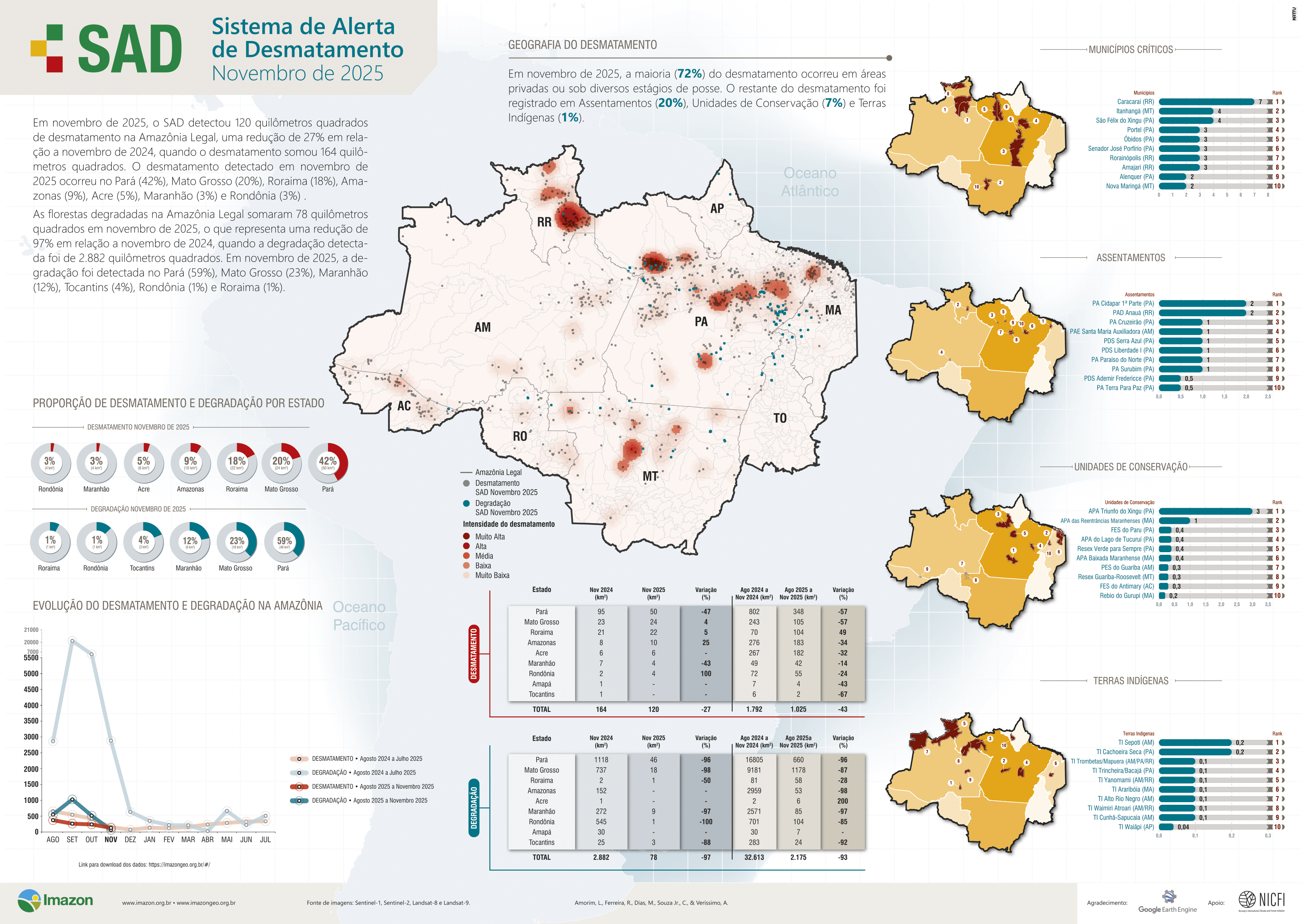 Em novembro de 2025, o SAD detectou 120 quilômetros quadrados de desmatamento na Amazônia Legal, uma redução de 27% em relação a novembro de 2024, quando o desmatamento somou 164 quilômetros quadrados. O desmatamento detectado em novembro de 2025 ocorreu no Pará (42%), Mato Grosso (20%), Roraima (18%), Amazonas (9%), Acre (5%), Maranhão (3%) e Rondônia (3%).