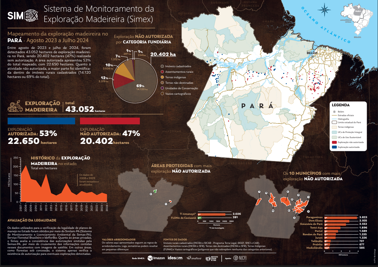 Entre agosto de 2023 e julho de 2024, foram detectados 43.052 hectares de exploração madeireira no Pará, sendo 20.402 hectares (47%) realizada sem autorização. A área autorizada apresentou 53% do total mapeado, com 22.650 hectares. Quanto à atividade não autorizada, a maior parte foi identificada dentro de imóveis rurais cadastrados (14.120 hectares ou 69% do total).