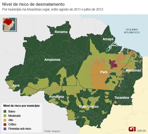 O levantamento do Imazon foi feito com base em dados registrados pela instituição, captados via satélite, e que são divulgados mensalmente. Estes números foram adicionados a um modelo estatístico criado em computador, que determinou a previsão. Ainda de acordo com o Imazon, o estado do Pará é o que mais poderá concentrar locais com alto risco de desmatamento (72%), seguido do Mato Grosso (11%).