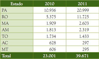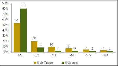 A maioria dos 611 títulos emitidos desde o início do programa está no Pará (54% dos títulos e 81% da área), seguido de Rondônia com 20% dos títulos em 9% da área. Os 335 títulos emitidos no segundo ano do Terra Legal representam apenas 1,4% da meta de 23.001 títulos anunciada pelo programa em 2010. Além disso, a meta para análise dos pedidos de regularização pelas coordenações estaduais do programa somam 20.020 processos em 2011, o que é incompatível com a meta de emissão de 39.671 títulos nesse mesmo ano. Assim, já é possível antecipar que essa meta de titulação deverá ser reformulada.