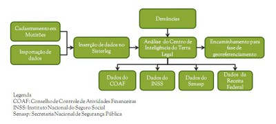 As informações básicas desses cadastros são disponibilizadas no sítio eletrônico do programa, incluindo nome do posseiro, endereço, tamanho do imóvel, município, Estado e número do processo. A partir do Sisterleg, os dados entram na fase de análise, quando são repassados ao Centro de Inteligência do Terra Legal, que envolve o Sipam e a Agência Brasileira de Inteligência (Abin). Esses dados são cruzados com informações do Conselho de Controle de Atividades Financeiras (Coaf), Instituto Nacional do Seguro Social (INSS), Secretaria Nacional de Segurança Pública (Senasp) e Receita Federal (por exemplo, com dados do Imposto Territorial Rural-ITR). A análise do Centro de Inteligência também detecta casos de cadastros que contêm o mesmo telefone ou que possuem o mesmo sobrenome para identificação de casos suspeitos de fracionamentoirregular de imóveis.