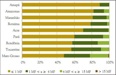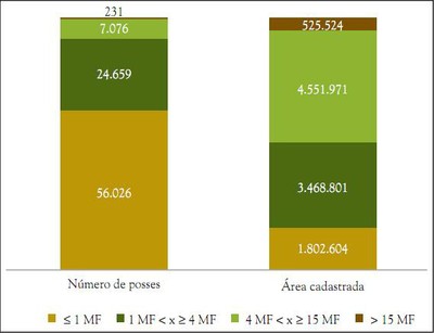 Além disso, a maior parte das posses cadastradas (64%) estava concentrada na categoria de até 1 módulo fiscal (que em média varia de 59 a 87 hectares na Amazônia Legal), considerando o tamanho médio de módulo fiscal por município. No entanto, essas posses ocupavam uma área de apenas 17% do total de cadastros. De fato, a maior parte da área cadastrada (78%) estava nas posses incluídas nas categorias que devem pagar pela regularização, entre 1 e 15 módulos fiscais, com destaque para imóveis entre 4 e 15 módulos fiscais (44%). Havia ainda 231 imóveis acima de 15 módulos fiscais, ocupando em torno de 525 mil hectares, mas que não podem ser regularizados pelo Terra Legal por excederem o limite de 15 módulos fiscais da Lei 11.952/2009.