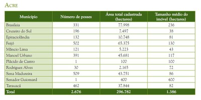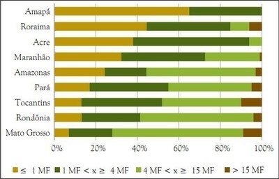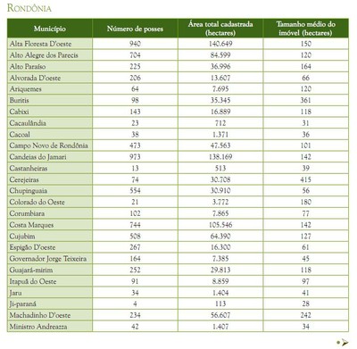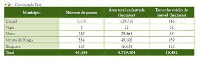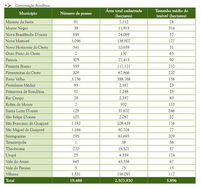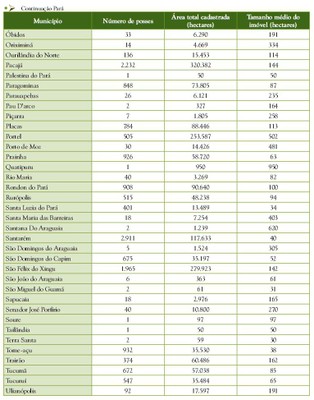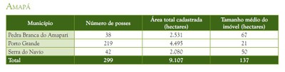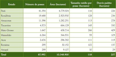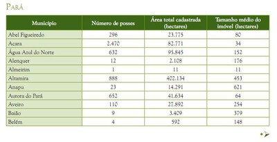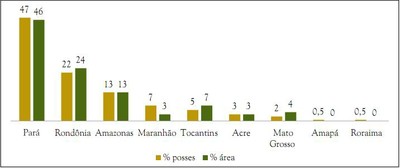 A maioria das posses cadastradas estava concentrada no Pará (47% de cadastros em 46% da área), seguido de Rondônia (22% de posses em 24% da área) e Amazonas (13% de posses em 13% da área) (Figura 5). Amapá e Roraima apresentavam menor quantidade de posses e área cadastrada, não alcançando 1% das posses e da quantidade de área cadastrada pelo programa.