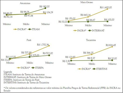 • Os valores de terra cobrados pelo governo federal e estadual precisam ser revisados e compatibilizados, além de levarem em consideração o valor de mercado para evitar estímulo a novas invasões e especulação fundiária.