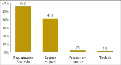 Em relação à análise dos pedidos de regularização, a maioria (56%) dos processos abertos a partir dos 87.922 cadastros ainda estava na fase inicial do trâmite, sendo classificados como casos com Requerimento Realizado. Outros 41%, cujos cadastros foram obtidos a partir de migração de dados de outros sistemas, ainda não estavam sob análise e estavam classificados como Registro Migrado. Apenas 2% (2.021 casos) já estavam em análise e, finalmente, 1% dos cadastros já havia recebido titulação, totalizando 611 títulos.