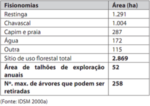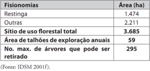 ● intensidade de exploração. Até 2002, a área total de cada um dos 16 planos de manejo já aprovados na área focal da reserva não excedia 2.000 hectares; o tamanho médio dos talhões era de 17 hectares; e o maior talhão tinha 52,7 hectares (Pires 2003).