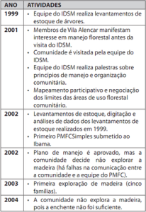 1998-1999: Em 1998, o governo brasileiro sancionou o Decreto 2.788 que criava o manejo comunitário simplificado, dando às comunidades da RDSM o direito de comercializar madeira legalmente. Em 1999, a equipe do IDSM iniciou as “primeiras etapas da implantação de um modelo de manejo florestal participativo em um dos nove setores da área focal da RDSM, com a realização de pesquisas participativas, treinamento operacional de moradores e usuários da reserva envolvidos na extração florestal e incentivo à participação das comunidades no manejo florestal” (IDSM 2002b). Em maio de 1999, foi organizado um fórum para discutir a legalização do MFC na RDSM, com representantes do Ipaam e Ibama, dos órgãos responsáveis pelo licenciamento da atividade e das comunidades (IDSM 2000b). Também em 1999, o MFC foi “formalmente” iniciado em cinco comunidades do Setor Tijuaca da RDSM (São Francisco, Nova Betel, Nova Betânia, Santa Maria e Vista Alegre). Essas comunidades participaram da criação de associações comunitárias, de levantamentos de estoques de árvores, da seleção de árvores a serem retiradas e da elaboração do PMFSimples e dos PCAs (IDSM 2002b).