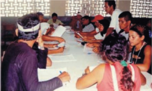 Esse treinamento tem caráter contínuo, e o aprendizado consolida-se principalmente durante a própria execução dos levantamentos de estoque. Além disso, o levantamento de estoque de árvores e muitos outros aspectos técnicos do MFC são discutidos e as decisões são tomadas juntamente com as comunidades. Por exemplo, os diâmetros mínimos de corte e a lista de espécies a serem preservadas são decididos em uma assembléia geral (Pires 2003).
