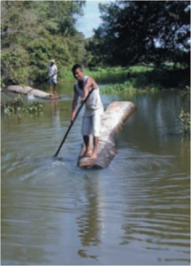 ● Não é utilizado maquinário pesado; as toras são transportadas em canoas durante o período de cheia. Quando se trata de madeira branca, a madeira é transportada boiando na corrente dos rios. São utilizadas também as gangorras, que facilitam o transporte das madeiras pesadas de dentro das áreas para o rio principal.