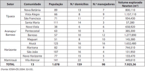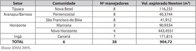2004: No primeiro semestre de 2004, 125 pessoas receberam treinamento em exploração em 19 comunidades. Porém, a maioria delas não conseguiu extrair madeira, pois a água não atingiu níveis suficientes para a sua retirada (IDSM 2004). Somente seis comunidades, localizadas em restingas baixas onde a cheia foi suficiente para a retirada da madeira cortada, conseguiram aproveitar parte da madeira manejada (IDSM 2004) (Tabela 2). Por essa razão, o volume total de madeira explorada em 2004 foi baixo em relação a 2003: 904,72 metros cúbicos.