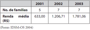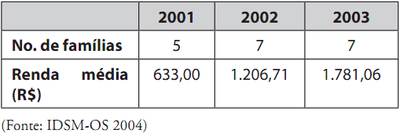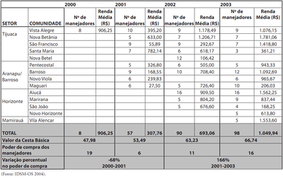 Em 2003, o primeiro ano de realização do manejo, a renda média por família (total de cinco famílias) proveniente da venda da madeira manejada em Vila Alencar era de R$1.553,60 (IDSM-OS 2004). Em 2004, essas famílias não conseguiram explorar madeira em virtude da enchente não ter sido suficiente para que eles pudessem retirá-la da floresta.