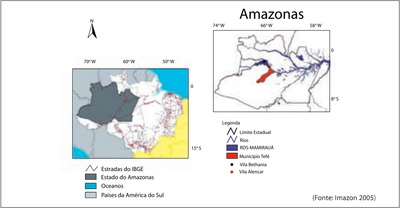 A RDSM está localizada na confluência dos rios Solimões e Japurá, nos municípios de Alvarães, Uarini, Fonte Boa e Marãa, no Estado do Amazonas, Brasil (Figura 1). A reserva dividi-se em duas partes: a área focal (260.000 hectares), onde são desenvolvidas as principais atividades do Projeto Mamirauá, e a área subsidiária (864.000 hectares).