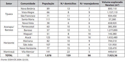 2003: Em 2003, 236 famílias, de 24 comunidades, em cinco setores na RDSM foram beneficiadas com o MFC (IDSM-OS 2004). Entre as 172 pessoas capacitadas em manejo florestal ao longo de 2003, 98 se beneficiaram com a produção de madeira manejada em 13 comunidades em quatro setores da reserva (Tijuaca, Aranapu/Barroso, Horizonte e Mamirauá) (Tabela 1). O volume total de madeira manejada em 2003 foi de 7.925,36 metros cúbicos (IDSM-OS 2004).