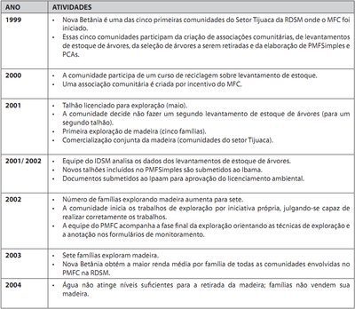 1996: Apesar da falta de regulamentação, nesse ano foram iniciadas as primeiras atividades do programa direcionadas ao MFC. O MFC foi implantado em cinco comunidades-piloto no Setor Tijuaca (Pires et. al. 2002). A equipe iniciou um trabalho de extensão florestal com as comunidades, cujos objetivos principais eram: (i) fortalecer as relações com os usuários dos recursos florestais da RDSM; (ii) incentivar a manifestação de dúvidas, expectativas e dificuldades relacionadas a essa atividade; (iii) pesquisar conhecimentos existentes e; (iv) incentivar o manejo florestal (IDSM 2002b).