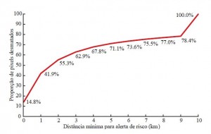 Figura 2. Comparação entre os resultados do modelo de risco de desmatamento e dados do Prodes para o período de agosto de 2011 a julho de 2012. Em média, o modelo previu desmatamentos a uma distância de sete quilômetros; com 71% dos desmatamentos à no máximo cinco quilômetros de algum local de risco.