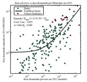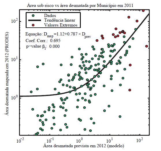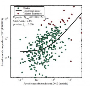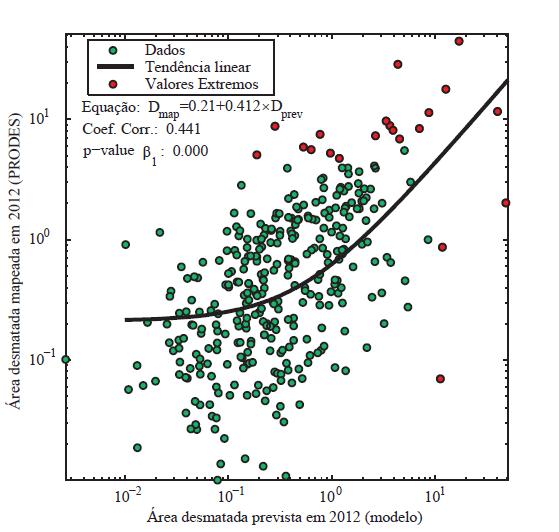 A Figura 3 mostra uma comparação entre a área de desmatamento estimada pelo modelo (eixo horizontal) e a área desmatada mapeada pelo Prodes (eixo vertical) em todos os Municípios da Amazônia. No gráfico, a reta mostra a tendência linear da relação entre as duas variáveis. A escala nos dois eixos foi log-transformada para facilitar a visualização dos pontos no gráfico. O gráfico indica boa relação entre estimativas e valores mapeados para Municípios com área desmatada maior que um quilômetro quadrado. Em geral, ouve correlação moderada entre o desmatamento detectado pelo Prodes nos municípios e a área desmatada prevista (r = 0,69). Os Municípios destacados em vermelho representam casos de Municípios onde o desmatamento mapeado diferiu da tendência da relação ajustada entre o desmatamento mapeado e o estimado pelo modelo, e esses Municípios estão listados na Tabela 1. Por exemplo, os Municípios de Cachoeira do Piriá e Brasil Novo são exemplos de Municípios onde o desmatamento foi significantemente abaixo do que o projetado pelo modelo, enquanto que os demais Municípios listados apresentaram desmatamento significativamente acima do projetado pelo modelo de acordo com o histórico. As maiores diferenças estão nos Municípios de Altamira (PA) Porto Velho (RO) e Lábrea (AM) que tiveram desmatamento bem maior que o projetado.