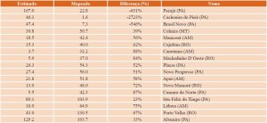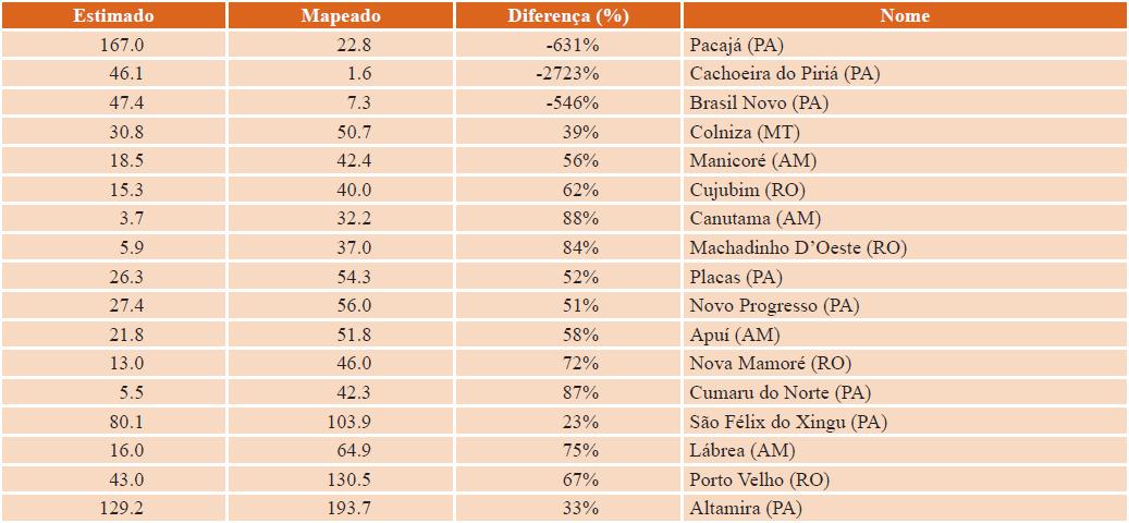 Tabela 1. Municípios considerados discrepantes na relação entre desmatamento mapeado e o desmatamento projetado pelo modelo. Valores positivos indicam desmatamento maior que o esperado, enquanto que valores negativos indicam desmatamento menor que o projetado pelo modelo.