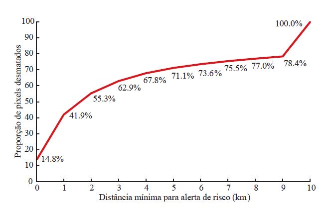 A avaliação do modelo de risco de desmatamento foi feita considerando a exatidão espacial e a exatidão global por Município, Áreas protegidas e Assentamentos. Definimos a exatidão espacial como a distância de locais de previsão para locais de desmatamento ocorrido, e a exatidão global como a capacidade do modelo de prever a área total desmatada em um determinado limite geográfico. A Figura 1 mostra a proporção de pixels desmatados em função da distância mínima para um pixel com risco de desmatamento significativo. Exatamente 10% dos pixels onde ocorreu desmatamento segundo o Prodes foram apontados como locais de risco pelo nosso modelo. Observamos também que 71% dos pixels com ocorrência de desmatamento localizaram-se a até cinco quilômetros de um pixel com risco de desmatamento significativo.