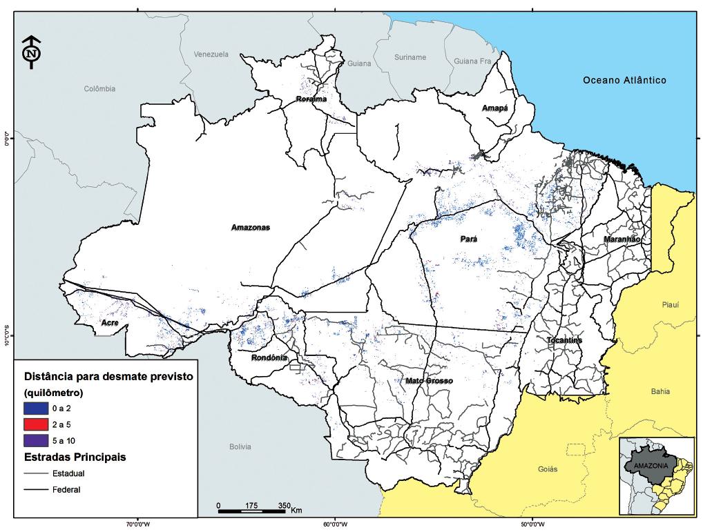 O modelo de risco discrimina espacialmente locais com maior ou menor probabilidade de desmatamento a partir de uma taxa anual de desmatamento projetada para um dado período. O modelo estimou a área total desmatada no período de Agosto de 2011 a Julho de 2012 em 7.134 quilômetros quadrados, dos quais, 2.721 quilômetros quadrados foram apontados como áreas de risco significativo. Nesse período, a taxa de desmatamento preliminar mapeada pelo Prodes foi de 4.656 quilômetros quadrados, representando uma diferença de menos de 53% em relação à taxa assumida no período. O motivo da grande discrepância pode ser atribuído ao acentuado decréscimo da taxa de desmatamento entre 2011 e 2012 resultante do sucesso das ações governamentais no combate ao desmatamento.