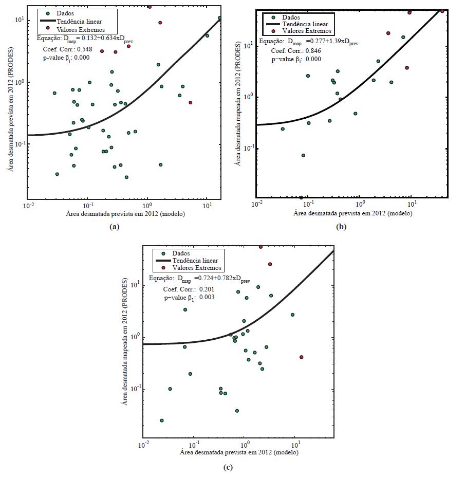 Figura 5. Relação entre a área desmatada prevista pelo modelo e a área desmatada mapeada pelo Prodes em (a) Terras Indígenas, (b) Unidades de Conservação Estaduais e (c) Unidades de Conservação Federais, em 2012.