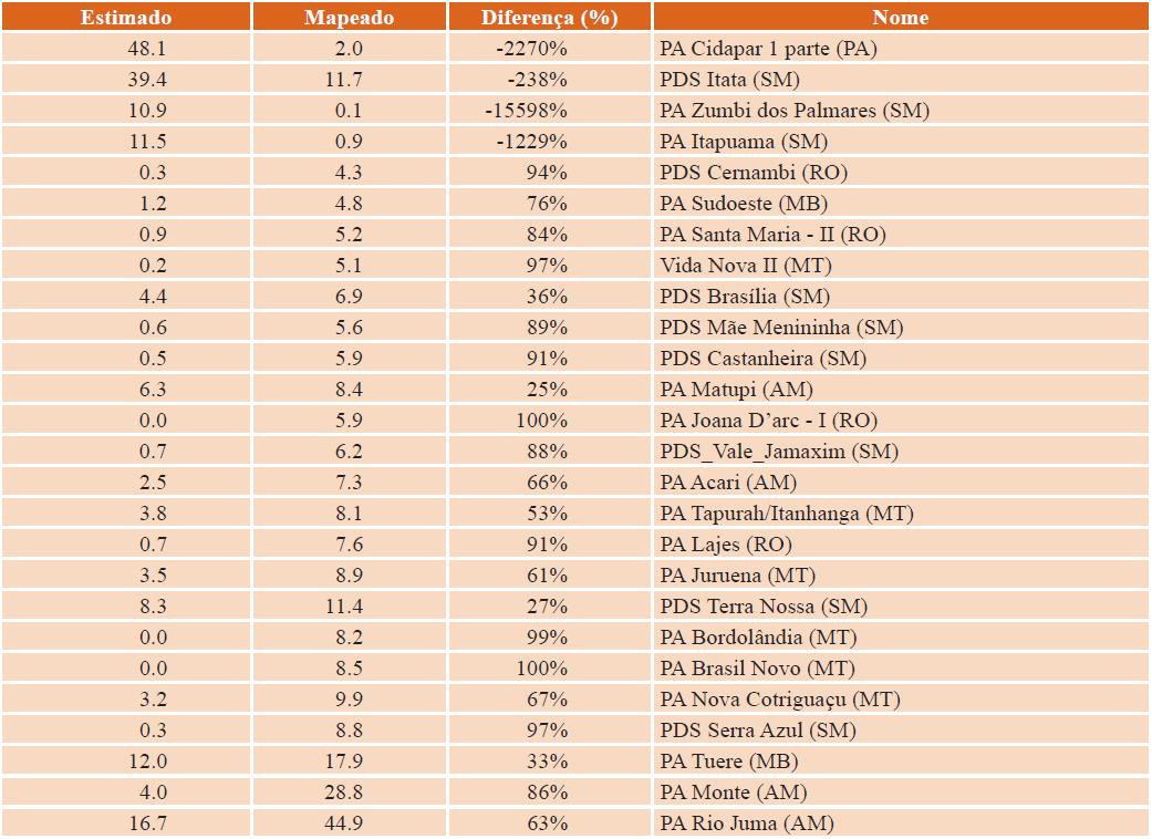 Tabela 2. Assentamentos considerados discrepantes na relação entre desmatamento mapeado e o desmatamento projetado pelo modelo. Valores positivos indicam desmatamento maior que o esperado, enquanto que valores negativos indicam desmatamento menor que o projetado pelo modelo.