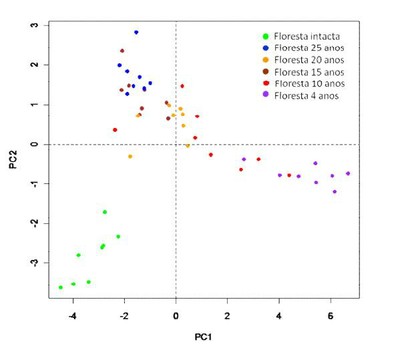 O abandono de áreas destinadas ao uso da terra pode levar a formação de florestas secundárias. Um mapeamento de larga escala realizado pelo INPE apontou que 18,4% das áreas desmatadas na Amazônia Legal, já estão em processo de regeneração. Por isso a importância da recuperação de florestas degradadas considerando, por exemplo, seu papel nas mudanças climáticas globais com o acúmulo de carbono em seus tecidos durante o crescimento. Porém, em um projeto de restauração florestal bem planejado é necessário a definição de parâmetros (indicadores) que servirão para avaliar se as metas da restauração foram cumpridas ou se os objetivos estão sendo atingidos. Desta forma, o objetivo deste estudo é comparar florestas secundárias por meio de indicadores ecológicos elaborados a partir de suas características estruturais e funcionais e responder às seguintes perguntas: (i) a análise dos indicadores confirma a hipótese de que quanto mais antiga a floresta maior sua semelhança com a floresta primária de referência? E (ii) é possível diferenciar as florestas utilizando estes indicadores? Para isso foram selecionados dez indicadores para comparar seis tipos de floresta localizadas no município de Paragominas, Pará. São elas: uma floresta primária e cinco florestas secundárias de 4, 10, 15, 20 e 25 anos de idade. A análise de componentes principais mostrou uma clara distinção entre as diferentes idades de florestas com relação aos indicadores. A análise de componentes principais mostrou uma clara distinção entre as diferentes idades de florestas com relação aos indicadores. O comportamento dos indicadores mostra que a floresta intacta possui maior semelhança com as florestas secundárias mais maduras e, consequentemente, está mais distante das florestas mais jovens.