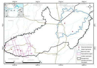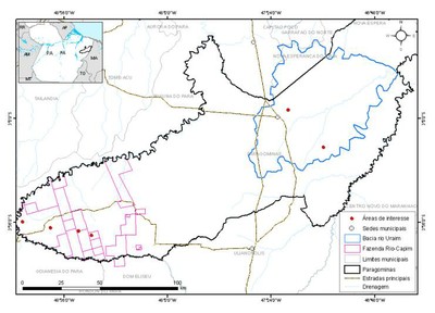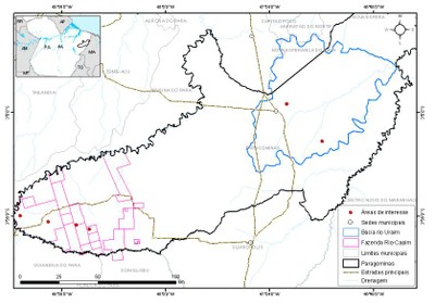 A segunda região é a bacia hidrográfica do Rio Uraim, com 492,7 mil ha, que ocupa cerca de 20% da área total de Paragominas (Figura 5.1). O rio nasce e tem a foz no município, constituindo um símbolo e a principal fonte de abastecimento de água para região, tendo vinte e sete rios que deságuam no seu leito. O rio é responsável por cerca de 50% do abastecimento de água de Paragominas[9] (informação pessoal), além de ser frequentado para atividades de lazer. Porém, grande parte das áreas de preservação permanente da bacia do Uraim já está desmatada: 59% (2.908 km2) segundo dados do programa do INPE de monitoramento do desmatamento na Amazônia (PRODES, 2009).