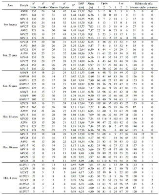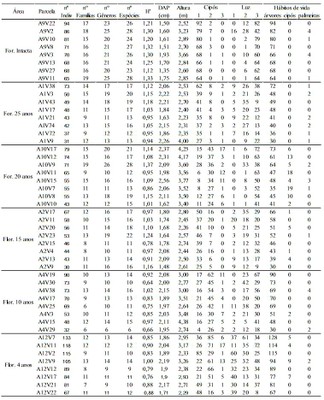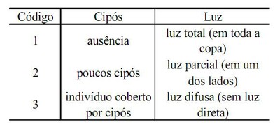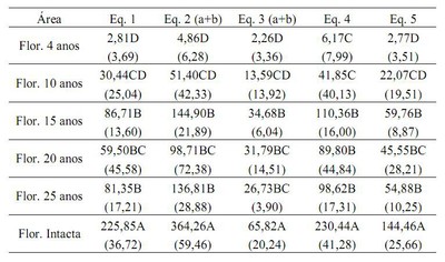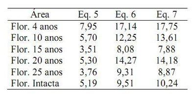 A Tabela 5.3 mostra a classificação das florestas secundárias segundo a intensidade de uso do pasto que existia anteriormente. A floresta de 20 anos apresentou a maior intensidade (moderada-intensa) devido ao tempo de uso do pasto (10 a 12 anos) e à frequencia de queima que foi superior às outras florestas, consideradas de uso leve.
