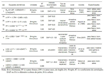 Este estudo teve por objetivo melhorar as estimativas de carbono em florestas secundárias da Amazônia central, utilizando equações alométricas para o método não-destrutivo. Avaliou a utilização de outras equações já existentes na literatura, comparando com as equações geradas no próprio estudo. Os autores encontraram que dois modelos originalmente baseados em florestas primárias superestimaram a biomassa em 10-60% para DAP entre 5-25 cm para a floresta secundária.