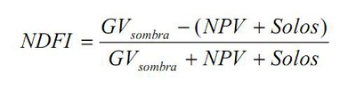 Onde, GVsombra é a fração de vegetação normalizada para sobra; NPV é a vegetação fotossinteticamente inativa e Solos é o solo exposto. Este índice varia de -1 a +1 e quanto maior o valor, menos degradada é a floresta.