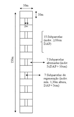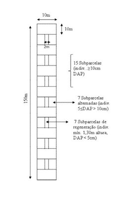 O tamanho destas parcelas foi de 10m x 150m (1500m2), adaptado de Higuchi, Santos e Jardim (1982). Após a delimitação em campo, foram coletadas as coordenadas geográficas dos quatro vértices de cada parcela. Essas coordenadas foram inseridas em um GPS Garmim modeloGPSMAP® 76CSx e alocados sobre a imagem de satélite de 2008, utilizando o software ArcGis 9.1 (Figuras 5.2, 5.3, 5.4, 5.5, 5.6, 5.7).