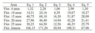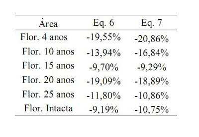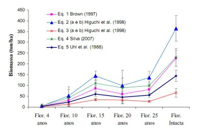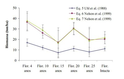 Segundo Nelson et al. (1999) a acurácia das estimativas de biomassa em florestas secundárias pode ser comprometida por três fatores. Primeiro, poucas equações foram desenvolvidas para as espécies mais comuns dessas florestas. Segundo, as equações publicadas para grupos de espécies geralmente derivam de florestas primárias, as quais possuem maior densidades de madeira e diferentes formas de desenvolvimento. Terceiro, mesmo quando a equação é desenvolvida para uma floresta secundária, sua utilização fora do intervalo biométrico para qual foi desenvolvida, pode levar ao aumento de erros nas estimativas.