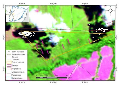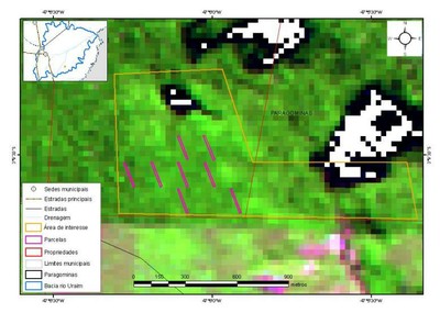 Figura 5.2 – Localização das parcelas experimentais na área de floresta secundária com 4 anos de idade. Bacia do rio Uraim. Imagem Landsat de 2008.