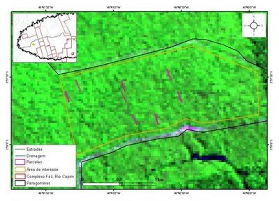 Figura 5.3 – Localização das parcelas experimentais na área de floresta secundária com 10 anos de idade. Complexo Fazenda Rio capim. Imagem Landsat de 2008.