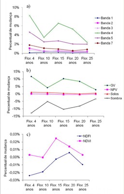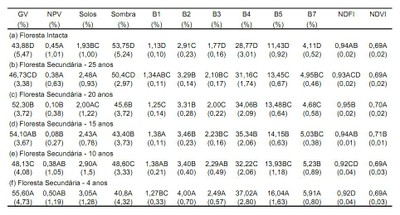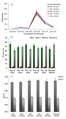 As imagens fração do modelo de mistura espectral, sombra e GV, mostraram a maior variação absoluta entre floresta intacta e as florestas secundárias quando comparadas às mudanças detectadas pela imagem em reflectância e índices de vegetação. Na escala de campo, esta diminuição do valor de sombra e aumento no valor de GV pode ser explicada pelo aumento no dossel da floresta, reduzindo a quantidade de sombra, aumentando a reflectância da floresta.