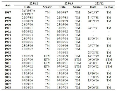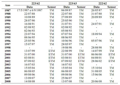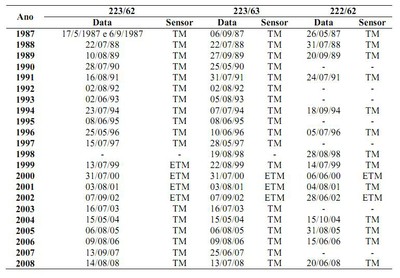 Neste estudo, foram utilizadas imagens de satélite dos sensores Landsat Thematic Mapper - TM e Landsat Enhanced Thematic Mapper - ETM (30 metros de resolução espacial) fornecidas pelo Instituto Nacional de Pesquisas Espaciais - INPE. A Tabela 5.1 mostra uma série temporal de 21 anos, entre 1987 e 2008, das imagens Landsat utilizadas. O complexo Fazenda Rio Capim é coberto pelas órbitas-ponto 223/62 e 223/63, enquanto que a bacia do rio Uraim é coberta pela órbita-ponto 222/62.